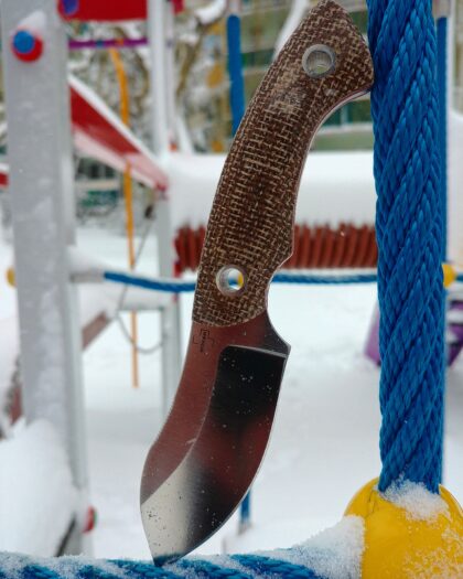 Wracając do samego noża warto wspomnieć, że projektantem tego maluszka jest Jesper Voxnaes. Ten Pan ma na swoimi rachunku kilkanaście fajnych projektów. Trochę bałem się, że nóż będzie miał za małą rękojeść. Tymczasem w ręku leży znakomicie, jak na tak małe rozmiary. Szeroka głownia, wysoki szlif to dobre połączenie. Nóż tnie dość dobrze i w codziennych użytkowaniu robi ,,robotę”. Używanie tak małych noży jest specyficzne i nie ma co się oszukiwać, że to trochę taki gadżet. Jednak ja lubię używać takich noży i sprawia mi to frajdę.