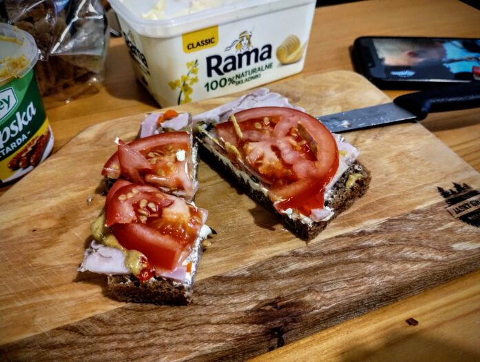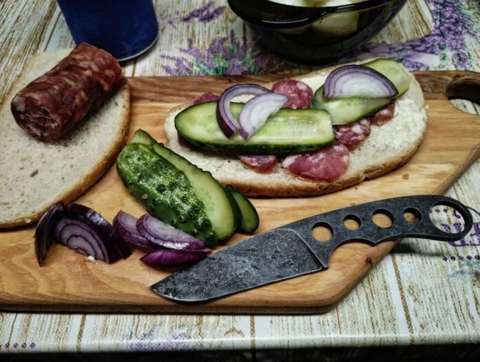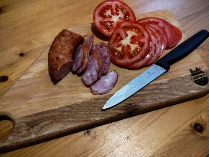 Zawsze lubiłem jeść z deski, talerz to nie mój świat. Chyba nauczyłem się tego od dziadka, który też kanapki lubił kroić nożem na mniejsze części. Teraz moja córka już ma to po mnie i jak tata nie zrobi „kaczuszek”to nie przejdzie. Przy okazji zawsze mogę bawić się nożem i testować ostrość.