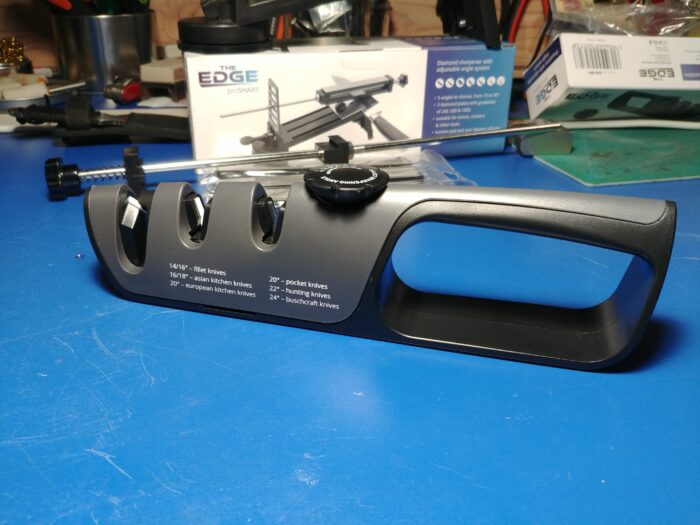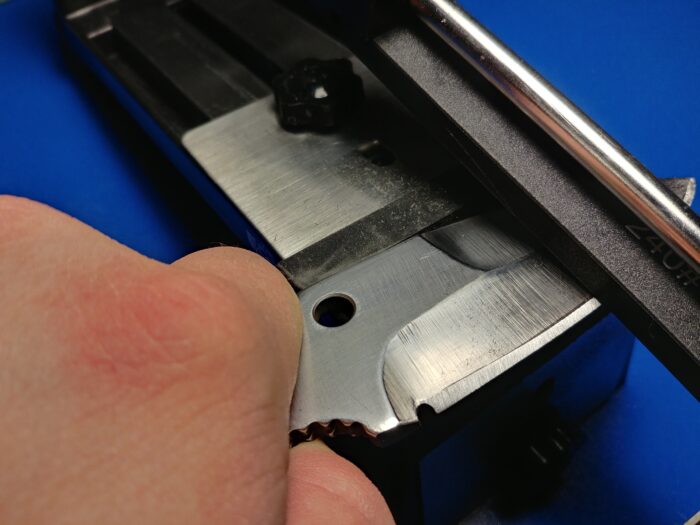 Dokręcałem z całych sił, przez to nie mogłem potem odkręcić, łatwiej było po prostu wyjąć nóż. Nie było to trudne, bo i tak się ruszał… Naostrzyłem na tym systemie kilkanaście noży, za każdym razem to samo… Nie zaryzykowałem ostrzenia moich skarbów i niestety rozczarowałem się. Trudno jest mi pisać o tym w taki sposób, jednak miałem bardzo duże nadzieje. Oprócz noży kuchennych ciężko jest ostrzyć coś innego. Konstrukcja niestety nie pozwala na ostrzenie scyzoryków, necków lub folderów. Ostrzałka nie ogarnia małych noży z wąskimi ostrzami. Za każdym razem piłowałem blaszkę mocującą nóż, zamiast KT.